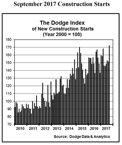 Nonbuilding construction in September was $147.1 billion (annual rate), down 3% from August. The public works categories as a group fell 6%, retreating for the second month in a row. Highway and bridge construction descended 6%, although September did include the start of several noteworthy bridge projects, including $452 million for renovation work on the George Washington Bridge in New York NY. During the first nine months of 2017, the top five states in terms of the dollar amount of highway and bridge construction starts were – Texas, California, Florida, Pennsylvania, and New York. The environmental public works categories showed September gains for river/harbor development, up 41%; and water supply construction, up 18%; while sewer construction slipped 1%. The miscellaneous public works category dropped 35% in September, continuing to recede from its exceptionally strong volume registered during the first half of 2017 that reflected the start of several major pipeline projects. The electric utility and gas plant category improved 10% in September, and included the start of three large gas-fired power plants, with two located in Pennsylvania ($750 million and $700 million), and one located in California ($550 million). The “no change” for total construction starts on an unadjusted basis during the January-September period of 2017 was the result of a varied pattern by major sector. Nonresidential building advanced 8% year-to-date, with institutional building up 18% while commercial building settled back 7%. The manufacturing plant category, up 35% so far in 2017 (aided by the start of several large petrochemical plants), contributed to nonresidential building’s year-to-date improvement. Residential building increased 1% year-to-date, as 7% growth for single family housing slightly outweighed a 13% decline for multifamily housing. Nonbuilding construction year-to-date dropped 11%, reflecting the 38% plunge for electric utilities/gas plants while public works was down only a slight 1%. By geography, total construction starts during the first nine months of 2017 showed this performance relative to a year ago – the Northeast, up 21%; the South Atlantic, up 2%; the West, up 1%; the South Central, down 7%; and the Midwest, down 12%. The 7% decline in the South Central reflected in part the comparison to last year that included $6.2 billion for two liquefied natural gas terminals, while the 12% decline in the Midwest reflected in part the comparison to last year that included the $3.8 billion Dakota Access pipeline and the $900 million Wanda Vista multifamily high-rise in Chicago.