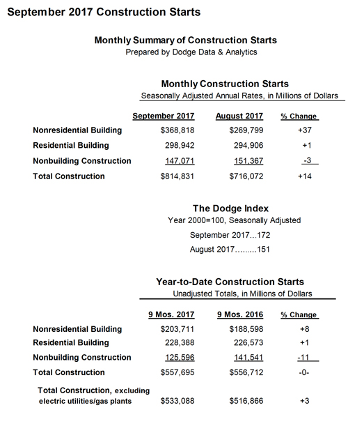 Nonresidential building in September was $368.8 billion (annual rate), a 37% gain compared to its August amount. The manufacturing building category surged 490% from subdued activity in August, boosted by the $6.0 billion ethane cracker facility in Monaca PA, in close proximity to the Marcellus shale gas field. The next largest manufacturing project entered as a September start was a $280 million poultry processing plant in Fremont NE. The institutional building categories as a group climbed 25% in September, led by a 145% hike for transportation terminal work. The $4.0 billion new terminal facility for Delta Airlines at New York City’s LaGuardia Airport, which will replace Delta’s C and D Terminals, joins the $3.4 billion Central Terminal Building project at LaGuardia Airport that was entered as a January 2017 start. Through the first nine months of 2017, airline terminal construction starts have totaled $14.0 billion, almost five times what was reported during the same period of 2016. Educational facilities, the largest nonresidential building category by dollar amount, increased 14% in September. There were ten educational facility projects valued at $100 million or more that reached groundbreaking in September, including a $243 million neuroscience building at the University of California San Francisco, the $200 million renovation of the Mid-Manhattan Library in New York NY, and a $150 million high school in Germantown MD. Healthcare facilities in September retreated 2%, although the latest month did include a $550 million medical center in St. Louis MO, a $183 million hospital in Frisco TX, and a $176 million medical center expansion in Vail CO. The smaller institutional project types showed a mixed performance in September. The public buildings category climbed 42% with the help of a $113 million criminal justice center complex in Nashville TN and a $91 million U.S. Land Port of Entry facility at Alexandria Bay NY. Declines were reported in September for religious buildings, down 5%; and amusement-related projects, down 59%. The reduced amount for amusement-related work was relative to an elevated August that included the start of the $1.2 billion expansion of the Javits Convention Center in New York NY. Even with the decline, the amusement-related category in September did include several noteworthy projects, such as the $140 million expansion to the Quicken Loans Arena in Cleveland OH.